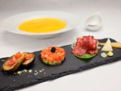 前 菜 馬刺し 二種のチーズ 小茄子のサルサ アボガドとサーモンのタルタル
